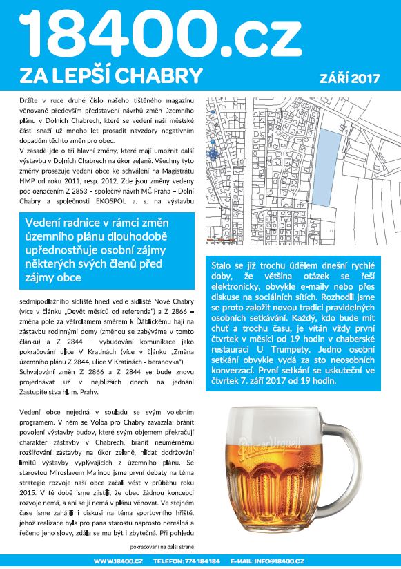 V pátek 1. září 2017 vyšlo již druhé číslo tištěného magazínu 18400.cz, sesterského média našich internetových stránek. Rozsah je opět 8 stran textu. Tentokrát jsme se zaměřili především na plánovaný rozvoj a změny územního plánu s tím související. Najdete v něm celkem čtyři články, na jejichž tvorbě se podílelo pět autorů (všichni členové spolku ZA LEPŠÍ CHABRY, z. s.) a přehlednou mapu připravovaných změn územního plánu Dolních Chaber na zadní straně. Pokud by Vám magazín do schránky nedorazil, kontaktujte nás ideálně emailem info@18400.cz nebo si stáhněte plnou verzi v PDF formátu ZDE.