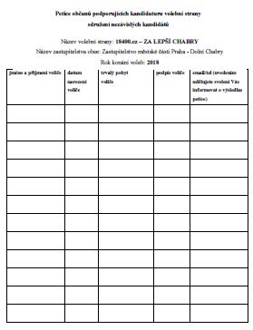 Pokud nám budete chtít vyjádřit svou podporu, stačí uvést jméno, adresu trvalého bydliště v Dolních Chabrech, datum narození a vlastnoruční podpis. Neznamená to, že nás nutně musíte na podzim i volit! Pozor, podmínkou podpory je trvalé bydliště v Dolních Chabrech.
